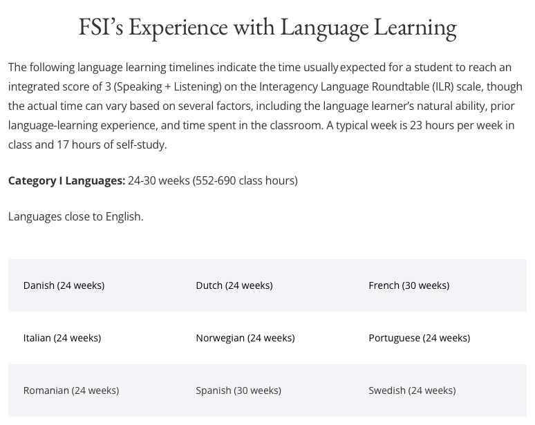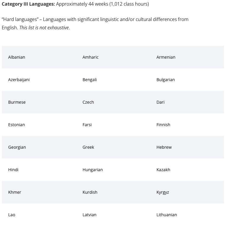 该学院的语言学家经过七十多年的研究与实践,根据各类语言与英语的相似程度对其进行分类,并设定不同的学习时长。