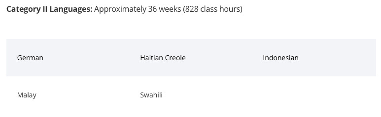 第二类语言包括德语、马来语、印尼语等,大约需要 830 小时的课堂学习时间。