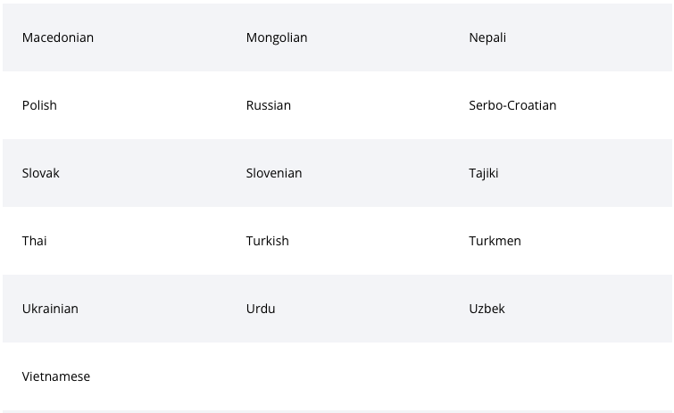 第三类则被归类为“较高难度语言”,这些语言在语法、词汇或文化方面与英语存在显著差异。这个类别包括的语言最多,其中包括俄语、藏语、希腊语、越南语等近 50 种语言。也能看出其实世界上跟英语有距离的语言和文化很多。