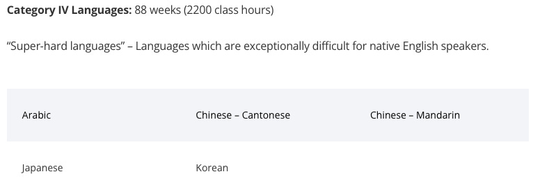 第四类被称为“极具挑战性的语言”,其中包括汉语、阿拉伯语、日语和韩语,学习时长约为 2200 小时,是第一类语言的三倍!