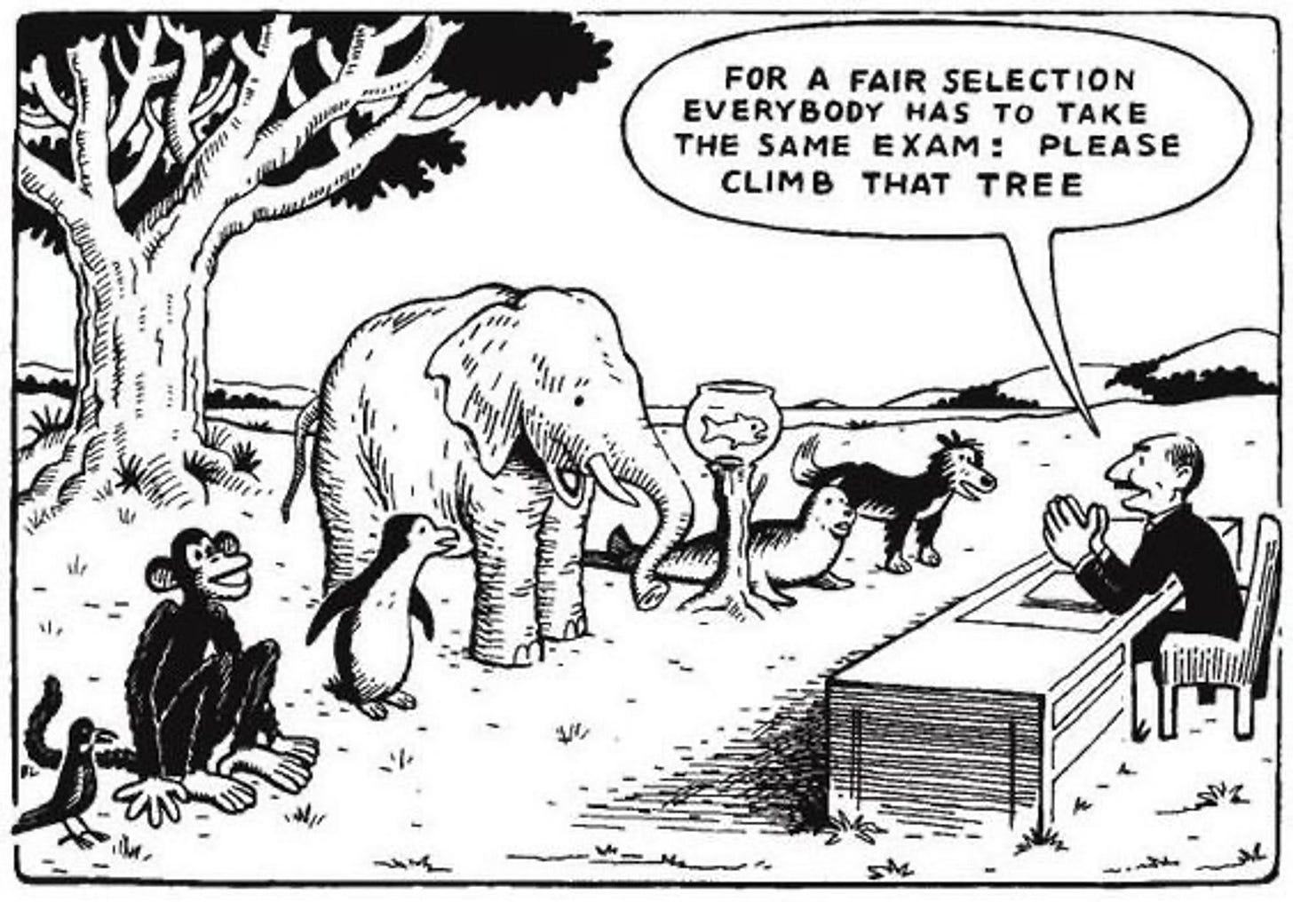 这张讽刺教育体系的漫画,由教育工作者 Micah Russell 所绘,颇为有名。图中,一位老师面对一群动物学生,包括鸟、猴子、企鹅、大象,甚至还有一条关在鱼缸里的鱼……老师堂皇地宣布:“为了公平起见,所有人都必须参加相同的测验——爬树。”
